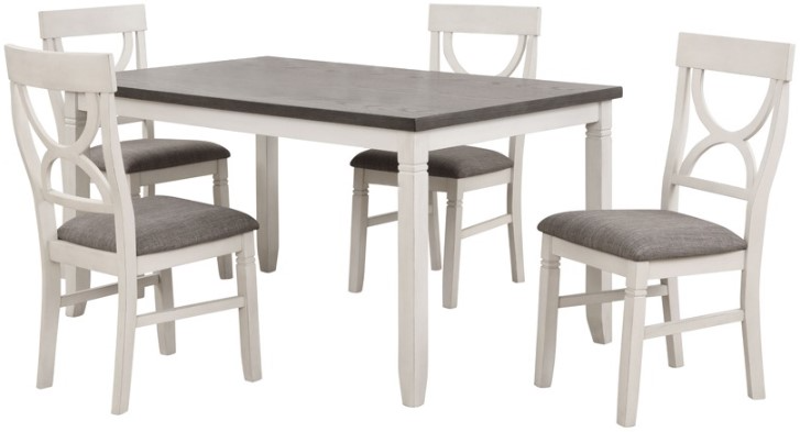 Anna Grey features a stylish two-tone rectangular table with sleek pencil legs. The coordinating side chairs showcase elegant X-back frames and comfortable upholstered fabric seats. Together, they create a warm, inviting look—perfect for bright, modern family dining areas.Read More