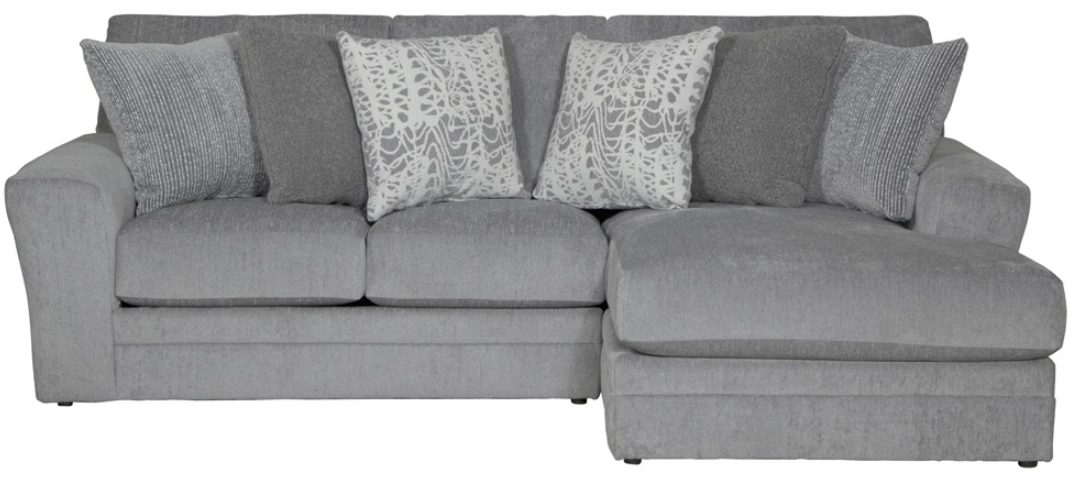 This 2PC Chaise sectional from the glacier collection is adorned in a gray Shark fabric. Throw pillows are covered in a seal and shark fabrics. Built with comfort seating by Comfor-Gel this will soon be your favorite seat in the house.Read More