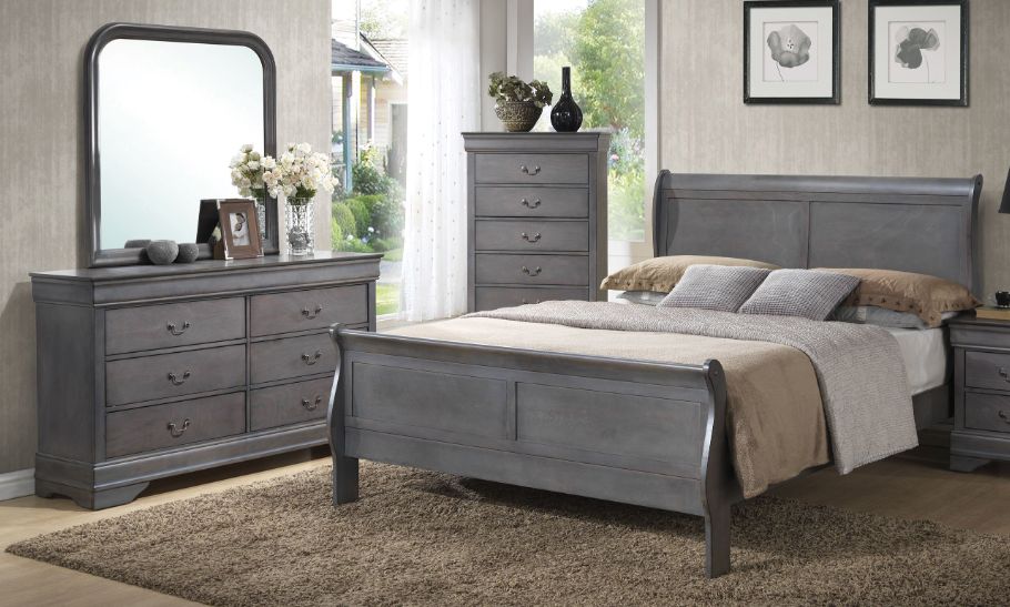 This 3-piece queen bedroom set features a sophisticated gray finish with elegant detailing. Curvaceous lines, traditional bracket feet, molding, and antique-style bail handle hardware come together for a timeless appeal. Designed for both style and comfort, it creates a cohesive and inviting atmosphere in your bedroom.Read More