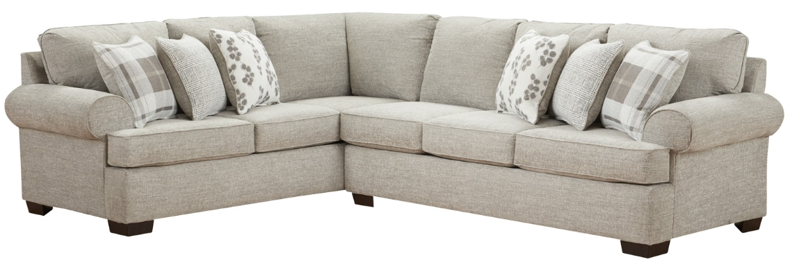 Mallory Ash, 2PC sectional, with six throw pillow (three on each piece). T seat cushion (one wing on each piece) welt on seat and back cushion. Traditional arm style with banded bottom. Total of six back cushions.Read More