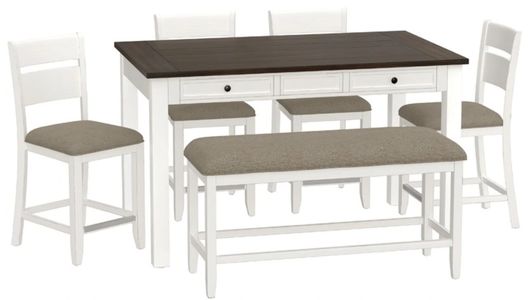 This six-piece dining set includes a spacious table, four comfortable chairs, and a matching bench. Built for everyday use, it features a sturdy frame with a warm brown and white finish that creates an inviting setting for family meals and gatherings.Read More