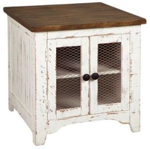 Double take. Sporting a two-tone finish that pairs a distressed vintage white with aged natural pine color, the Westfield tables elevates the art of rustic farmhouse living. Enhancing its charm: shelved storage visible through the cabinet door with inset metal grill.Read More