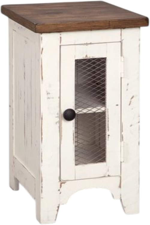 Double take. Sporting a two-tone finish that pairs a distressed vintage white with aged natural pine color, the Westfield tables elevates the art of rustic farmhouse living. Enhancing its charm: shelved storage visible through the cabinet door with inset metal grill.Read More