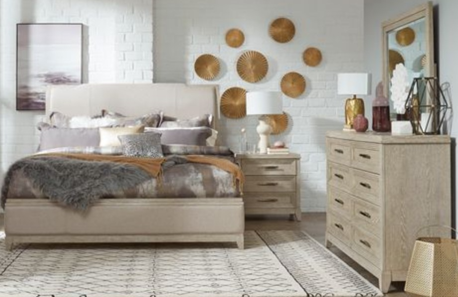 Elevate your luxurious home with the Belmar California king upholstered bed, dresser, mirror, and nightstand. Shown in Knubby, Silver Champagne and Washed Taupe. Add this sophisticated bedroom kit to your contemporary space.Read More