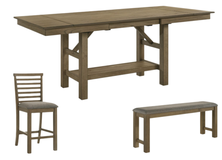 Includes the gathering table, 1 upholstered counter bench and 4 upholstered ladderback counter chairs