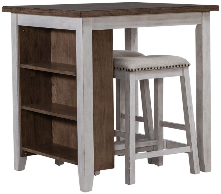 Perfect for small space dining or home office area. Brook Creek offers multiple finish options. A casual styling that fits into any decor. Features bookcase table with two fixed shelves for more storage, tapered legs, and two padded counter height stools with accent nail heads. All packaged in one box.Read More