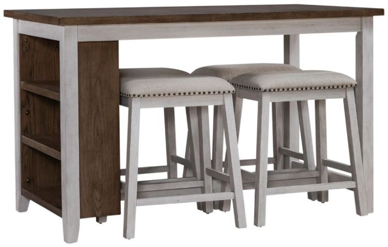 Perfect for small space dining or home office area. Brook Creek offers multiple finish options. A casual styling that fits into any decor. Features bookcase table with two fixed shelves for more storage, tapered legs, and four padded counter height stools with accent nail heads. All packaged in one box.Read More