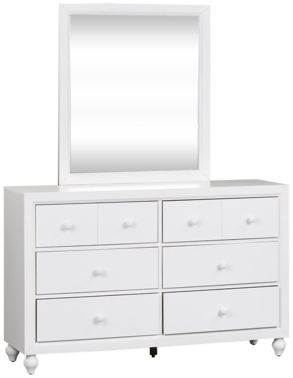 Design possibilities are endless with the Cottage View dresser and mirror. Crafted of melamine and rubberwood solids, this kit features a white finish, picture frame solid wood case molding, bluff-cut top drawers, bun feet, and is accented with wooden knob hardware.Read More
